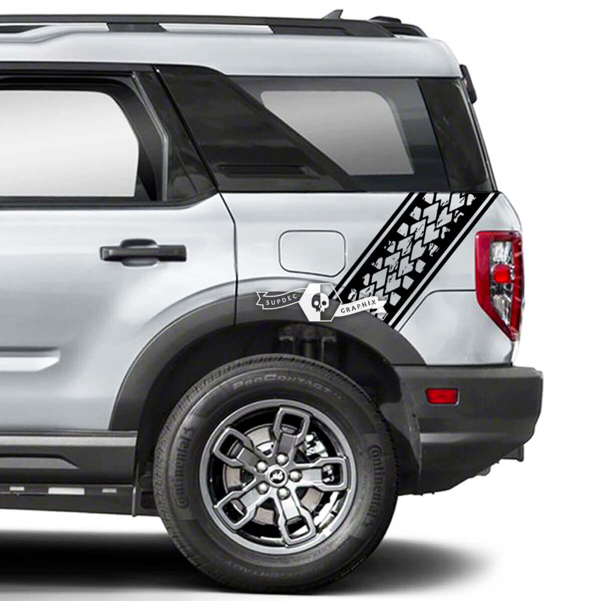 Ya sea que esté recorriendo senderos o simplemente quiera personalizar su vehículo, estas calcomanías laterales de huella de neumático ofrecen una mejora elegante y duradera para su Ford Bronco.