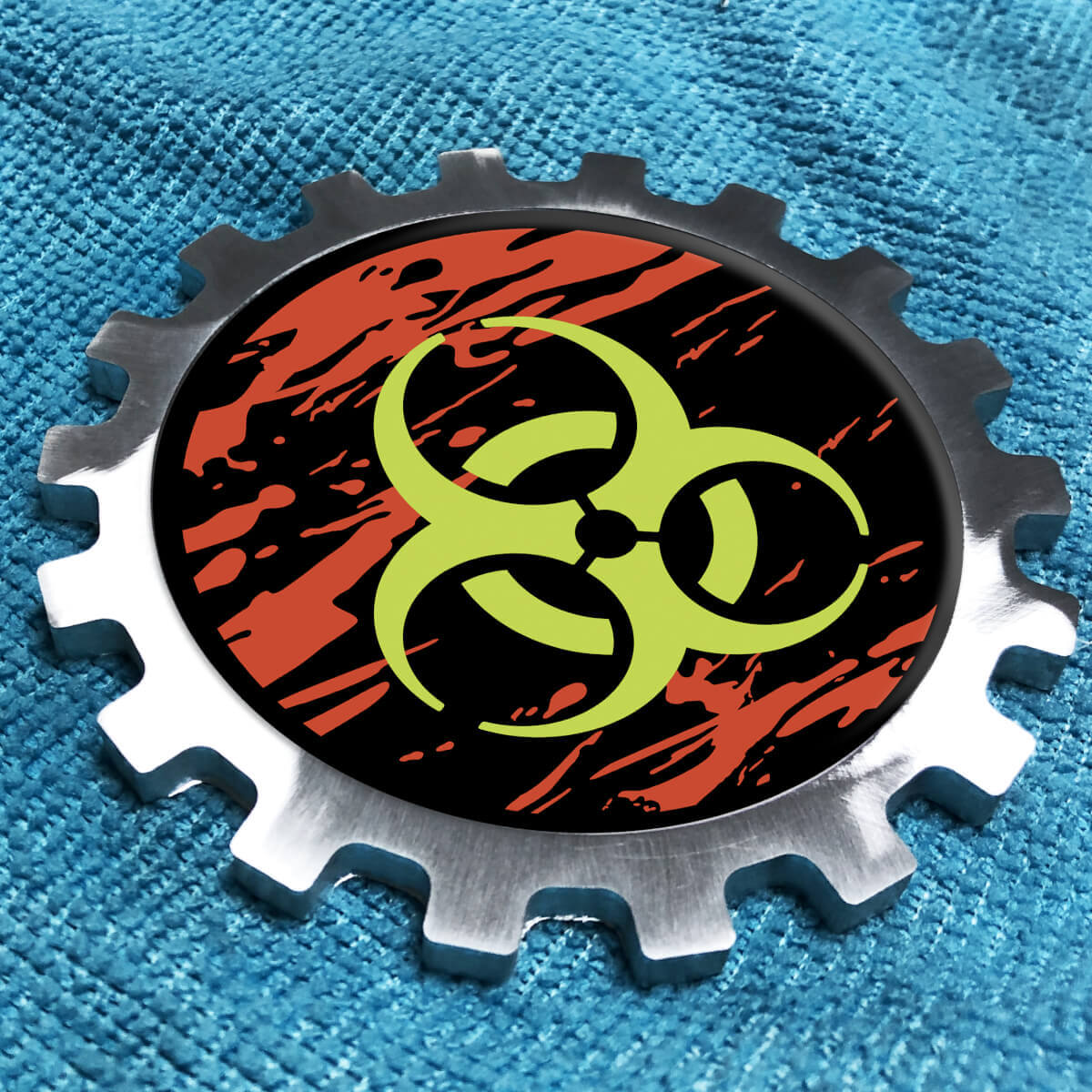 Logotipo desgastado de Biohazard, insignia de aluminio y Metal, emblema de engranaje de cabecera de aluminio