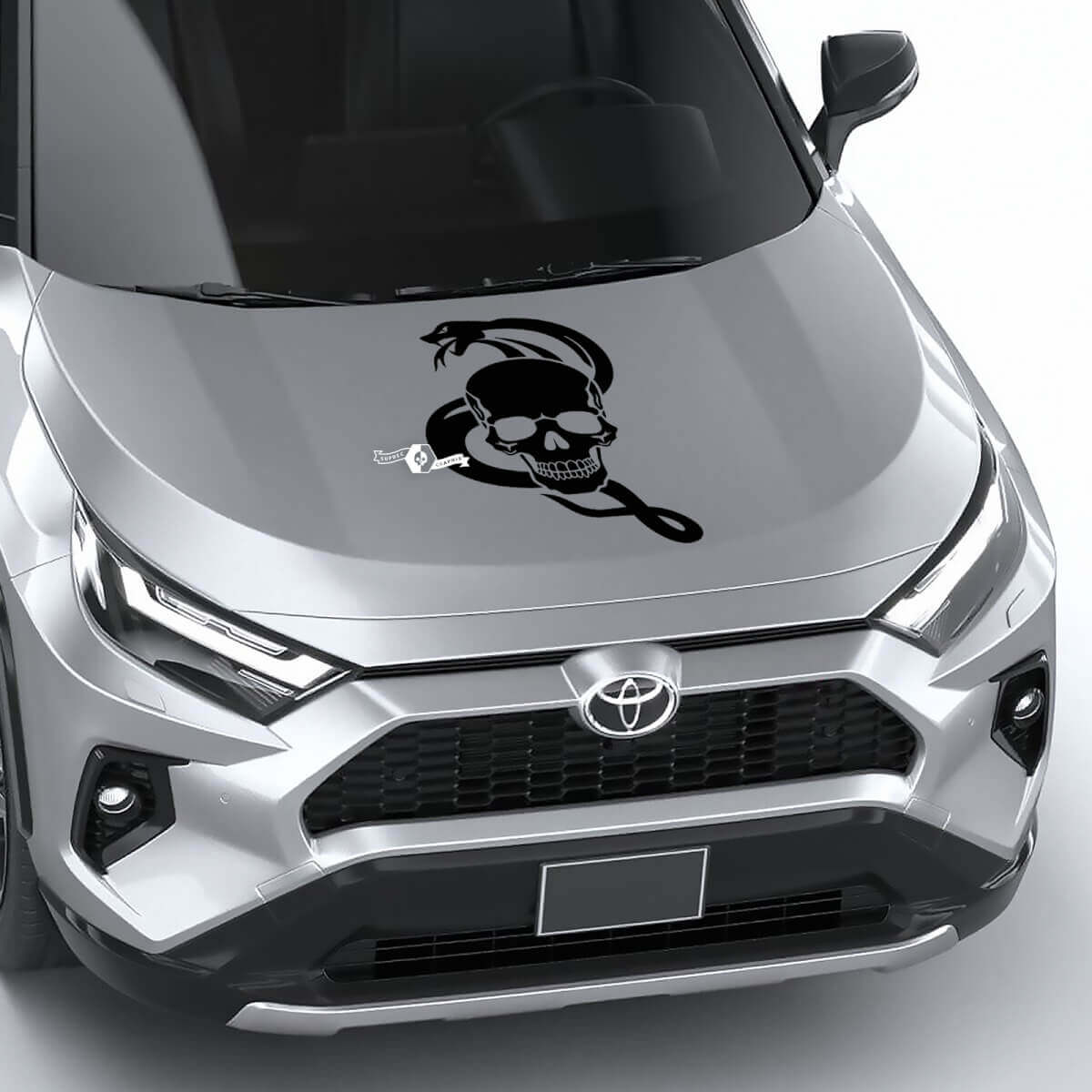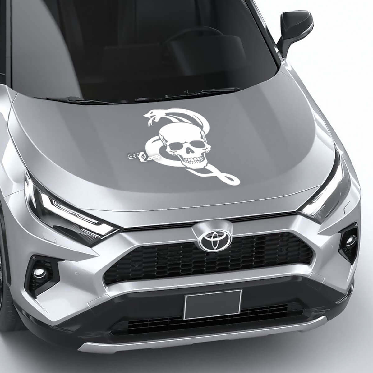 Transforma tu vehículo con la llamativa Calcomanía Vinílica Universal para Capó de Serpiente con Calavera. Este diseño impactante presenta una serpiente detallada entrelazada con una calavera, perfecto para entusiastas de autos que desean añadir un toque personalizado y agresivo.