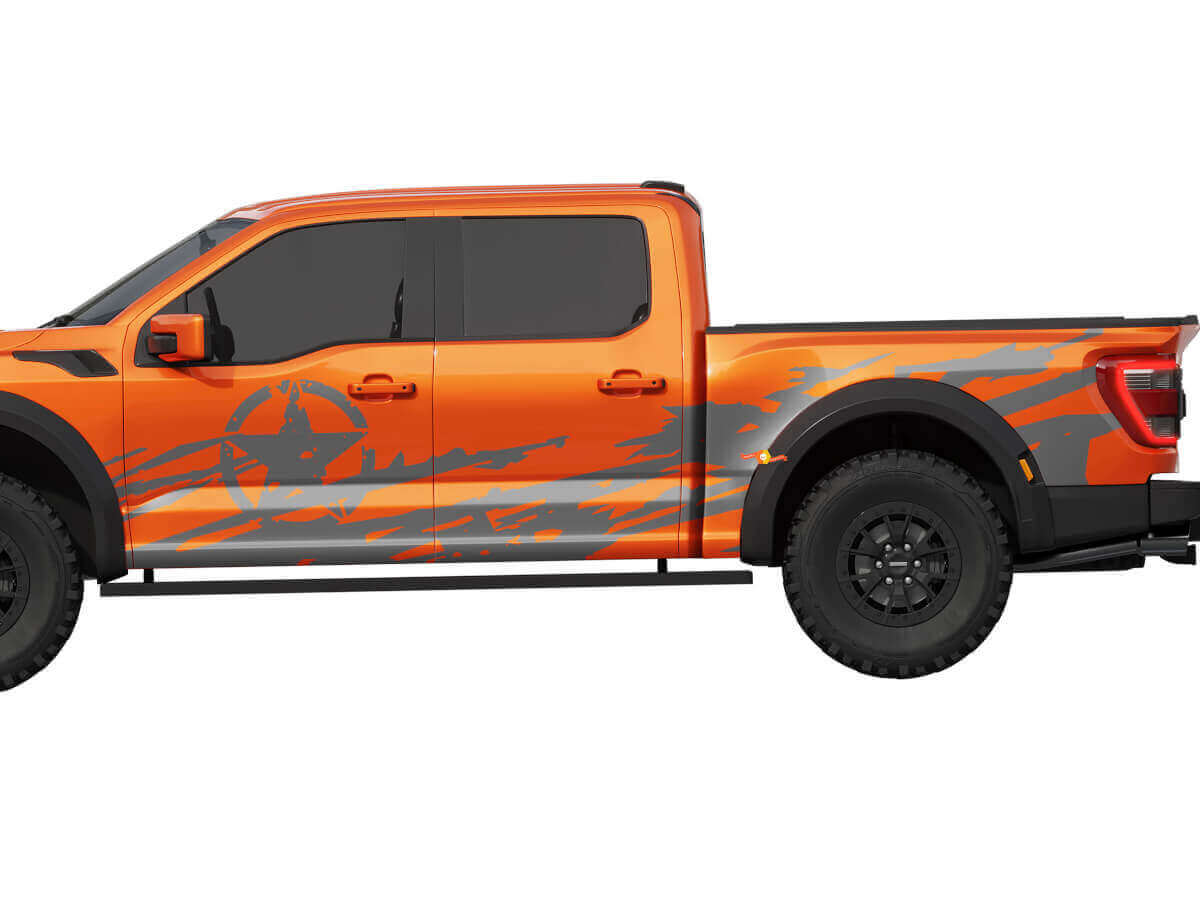 Mejora el aspecto de tu camión y rinde homenaje a la milicia con nuestros gráficos de calcomanías laterales con estrella militar universal. ¡Ordena ahora y experimenta la diferencia!