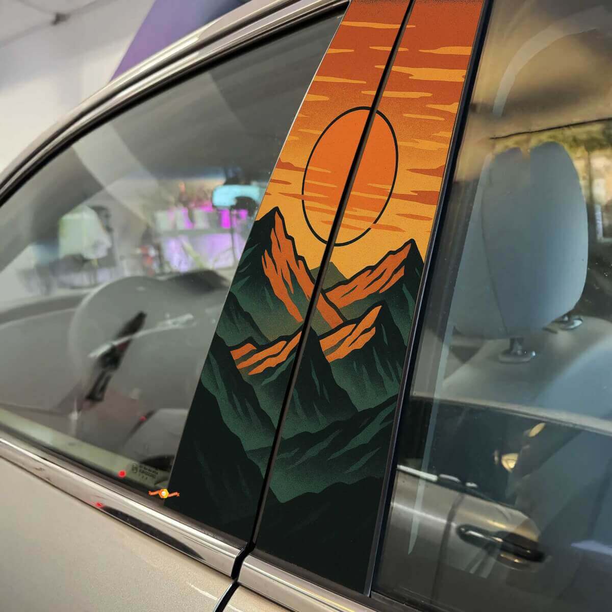 Calcomanía de vinilo con diseño de montañas retro al atardecer para puertas tipo pilar